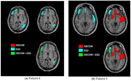 Patients 4 and 5 were diagnosed with extra-temporal epilepsy and, as the rest of patients, did not present appreciable lesions in the structural MRI. Both cases were diagnosed with multifocal epilepsy, and they were not subjected to surgical intervention. The estimation of the sources from ictal ESI revealed extensive cortical zones that includes bilateral temporal and frontal lobes for both cases (Figure 3 in blue). SISCOM results showed confined regions in the right frontal and left temporal for patient 4 (Figure 3a in red) and in frontal and temporal lobes bilaterally for patient 5 (Figure 3b in red). Ictal ESI incorporating SISCOM as a prior (Figure 3 in green) consisted of scattered zones in both hemispheres and lobes (temporal and frontal). Unlike the previous cases, it is not possible to determine spatially confined EZ. The methodology proposes scattered and diverse EZ, which is consistent with the diagnosis of multifocal epilepsy.