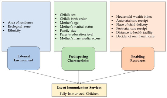 Explanatory variables were selected based on the existing literature, prior knowledge, and availability of variables in the dataset and a framework was developed on the light of Anderson’s Behavior Health Model [14]. The model has been used widely to examine the factors associated with the utilization of health services including immunization uptake [19,20,21]. On the light of Anderson’s model and based on the literature, explanatory variables were grouped into three categories: external environment, predisposing factors, and enabling factors (Figure 1). The external environment includes area of residence, ecological zone, and ethnicity. Predisposing factors include sex of children, childbirth order, mothers’ age at child delivery, current marital status, parental (mother and father) education, and access to mass media. Enabling factors included wealth index, utilization of ANC and postnatal care (PNC), place of delivery, health care decision-maker, and distance of health facility. In this analysis, categorization of continuous variables was done in the light of previous literature. Self-reported parental educational attainment was used and categorized as “no education,” “primary,” “secondary,” and “higher.” No education refers to not attaining any formal education, primary is defined as completing grade 5, secondary as completing grade 10, and higher is defined as attaining more than grade 10. We had utilized the predetermined wealth index category provided in the dataset where it was generated from selected household assets using principal component analysis (PCA) and classified into five groups as: “poorest,” “poorer,” “middle,” “rich,” and “richest.” Decision-making ability of mothers’ health care was categorized into four groups as “herself,” “jointly with husband,” “husband alone,” and “other.” Further, childbirth order, family size, and access to mass media were also categorized and included as the explanatory variable in this analysis.