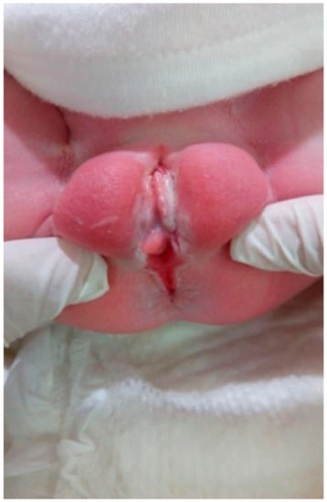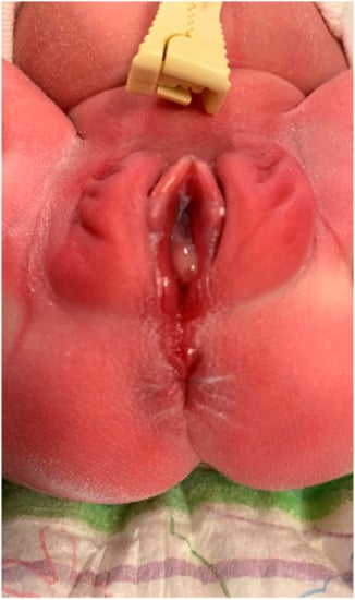 Perineal groove is a rare congenital malformation of the perineum characterized by a non-epithelialized mucous membrane that appears as a wet sulcus in the perineal midline, extending from the posterior vaginal fourchette to the anterior anal orifice []. The lesion is usually a well-defined, erythematous, superficial mucosal band, replacing the normal perineal skin [] with an upward direction from the 12 o’clock position of the anal opening towards the posterior fourchette []. According to Stephens et al., three criteria need to be met in order to define this malformation: (1) Wet groove; (2) hypertrophy of minoral tails; and (3) normal anatomy of both genitalia and urethra []. In their retrospective review, Esposito et al. presented six cases of perineal groove in their center in eight years, but in general, the incidence is unknown []. It seems to appear more frequently in females than males; there has only been one case of perineal groove combined with hypospadias and bifid scrotum described in a male newborn [].