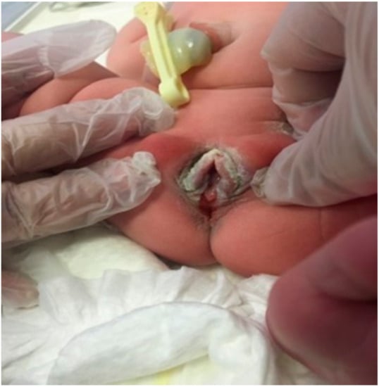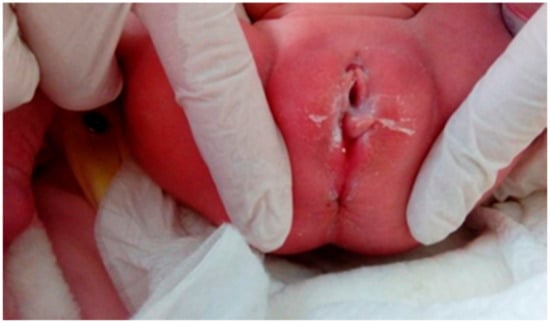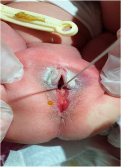 - Siruguppa, K.; Tuli, S.S.; Kelly, M.N.; Tuli, S.Y. Newborn female with a midline perineal defect. Clin. Pediatr. 2012, 51, 188–190. [Google Scholar] [CrossRef] [PubMed]
