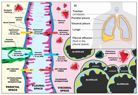 The pleural space forms between the fourth and seventh week of embryonal development. The visceral and parietal pleurae both derive from the lateral plate mesoderm which splits the somatopleuric mesoderm into two layers forming the parietal membrane and the splanchnopleuric mesoderm of the visceral membrane. Both are of vital importance for the homeostasis of the pleural space [6]. The pleural mesothelium, derived from the embryonic mesoderm, is a monolayer of mesothelial cells that blanket the chest wall and lungs on the parietal and visceral surfaces, respectively. These pavement-like cells are similar in cytologic characteristics to mesothelial cells that line other body cavities, such as the peritoneum [7]. The pleural mesothelial cell is the most common cell in the pleural space and is the primary cell that initiates responses to noxious stimuli [6]. The cells produce a number of different molecules, some of which are: Hyaluronic acid, glycoproteins, nitrous oxide and growth factor beta 1 [8]. Figure 1a shows a rudimentary schematic of the lungs, the pleura and the pleural space. In normal circumstances, the pleural membranes are separated by a narrow lining of fluid, which is being produced and reabsorbed by the pleura. The production depends on hydrostatic and oncotic differences in the systemic pressure of the pulmonary circulation and pleural space. Figure 1b presents the balance of forces that regulate the amount of fluid formation in the pleural space. The absorption of fluid from the pleural space is regulated by pleural vessels. In normal physiological conditions, there is 0.26 mL of fluid per kg of body mass in the pleural space [8].