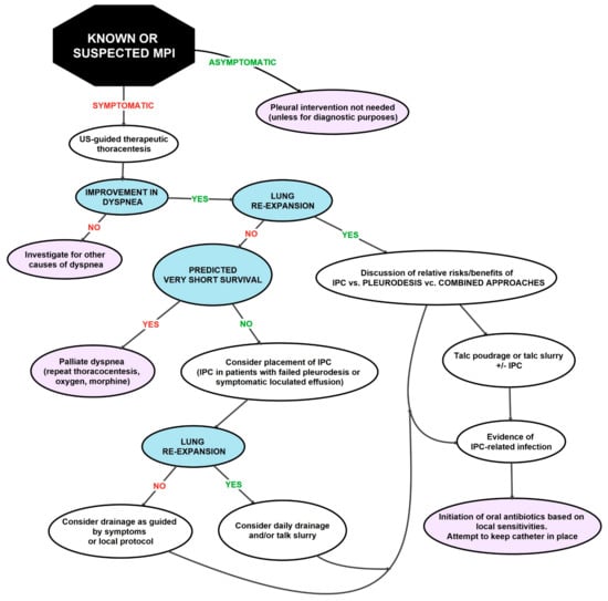 Therapeutic thoracentesis is the first step in management and is recommended to be performed in most patients with dyspnea. The advantages of US thoracentesis are improved safety, ease of execution, as well as a reduced number of complications [66,71]. Definitive pleural intervention is intended for patients with slow progression of the disease, patients who have a very short survival or poor performance status [71].