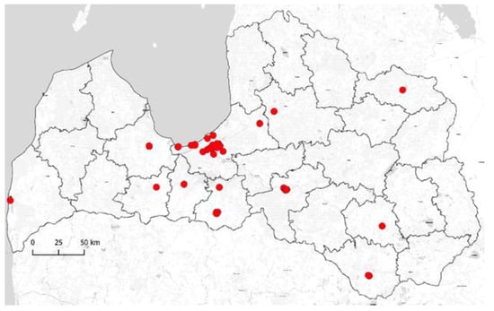 - Valciņa, O.; Pūle, D.; Lucenko, I.; Krastiņa, D.; Šteingolde, Ž.; Krūmiņa, A.; Bērziņš, A. Legionella pneumophila Seropositivity-Associated Factors in Latvian Blood Donors. Int. J. Environ. Res. Public Health 2015, 13, 1–8. [Google Scholar] [CrossRef] [PubMed]