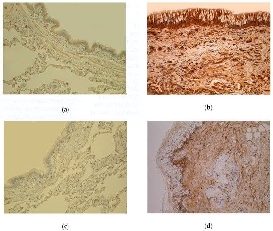 Overall, in the control group, the numbers of immunoreactive cells in bronchial epithelium, bronchial cartilage, alveolar epithelium, and among alveolar macrophages were evaluated mostly higher, whereas in bronchial mucosal connective tissue, blood vessel wall, smooth muscle, and glands they were mostly lower. We found higher numbers of immunoreactive cells positive for IL-4, IL-7, IL-10, and IL-12 in bronchial epithelium, IL-7, IL-8, IL-10, MMP-2, TIMP-2, Hsp-70, hBD-2, and hBD-3 in bronchial cartilage, TIMP-2, Hsp-70, hBD-2, hBD-3, and hBD-4 in alveolar epithelium, as well as IL-4, IL-6, IL-7, IL-8, IL-10, TNF-α, MMP-2, TIMP-2, and hBD-2 in alveolar macrophages.