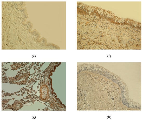 The number of IL-1α (Figure 1b,c), MMP-2 immunoreactive cells varied from occasional positive cells (0/+) to moderate to numerous (++/+++) positive cells. IL-4, IL-8, TNF-α, TIMP-2 immunoreactive cells were evaluated in a range from few positive cells (+) to numerous (+++). In the COPD group, appearance and distribution of IL-6 immunoreactive cells were evaluated ranging from few (0/+) immunoreactive cells to moderate (++) numbers. In the COPD group, few to moderate numbers (+/++) to numerous (+++) immunoreactive cells for IL-10 were found. Numbers of IL-12, TGF-β1, hBD-2 (Figure 1e,f) immunoreactive cells in the COPD group were evaluated ranging from few (+) to moderate to numerous (++/+++). The findings of all cytokines and chemokines were more evident at inflammation sites with infiltrating immune cells visible and in granular tissue. The numbers of hBD-4 and hBD-4 immunoreactive cells ranged from no positive (0) and occasional (0/+) cells, to few to moderate numbers (+/++), respectively. The findings of Hsp-70 immunoreactive cells varied from no positive (0) cells to few (+) being the lowest result of all examined markers (Figure 1g,h).