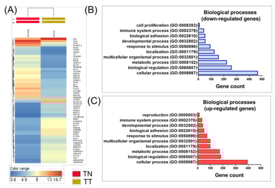 Hierarchical clustering and gene ontology classification for gene expression data in papillary thyroid cancer versus normal thyroid tissue. (A) Heatmap for papillary thyroid cancer, using malignant tissues (n = 505) and normal tissues (n = 59). Significantly overexpressed genes are highlighted in red and underexpressed genes are shown in blue, emphasizing distinct PTC subtypes with clinical and biological relevance; (B) and (C) Biological classification, based on the gene expression signature, in tumor versus normal tissue in PTC patients (by using the online PantherDB tool). (TN: normal thyroid tissue, TT-tumor thyroid tissue).