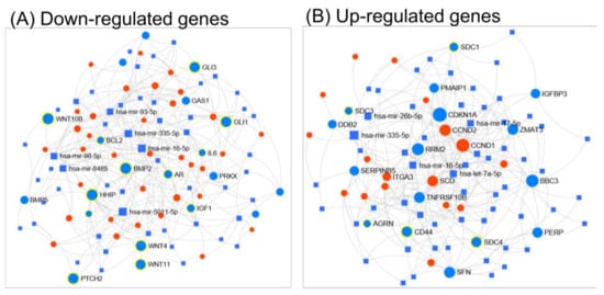 The representative miRNA-gene network interactions between the genes with an altered expression levels when comparing tumor to normal tissue and their respective miRNAs, generated using miRNet. (A) shows mRNA–miRNA network for down-regulated genes in PTC, involved in the Hedgehog signaling pathway (n = 15, p-value = 0.000212), Axon guidance (n = 18, p-value = 0.0359) and basal cell carcinoma (n = 10, p-value = 0.0373), while (B) shows mRNA–miRNA network for up-regulated genes in PTC, associated with the p53 signaling pathway (n = 16, p-value = 0.0000254), ECM-receptor interaction (n = 18, p-value = 0.0000254) and pathways in cancer (n = 29, p-value = 0.0935). The genes belonging to these aforementioned pathways are highlighted with blue dots, while the red dots represent the genes with altered expressions involved in other interconnected pathways. The blue squares represent the miRNAs that target the altered genes, where the size of the square is proportional to the number of signaling pathways involved (based on KEEG classification).