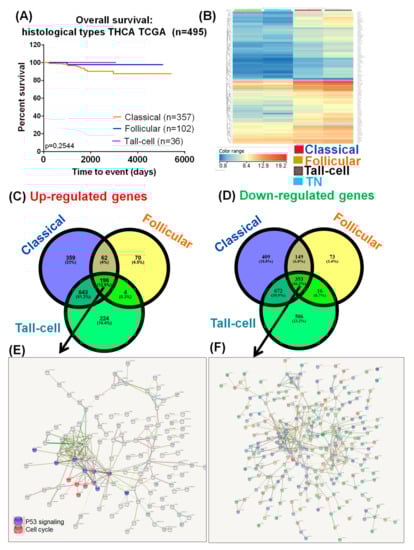 The survival rates of patients with PTC were not significantly different (Figure 3A), despite the fact that important alterations among the three selected subtypes of PTC were observed (classical PTC versus adjacent normal tissue, follicular PTC versus adjacent normal tissue, and tall-cell PTC versus adjacent normal tissue). The frequencies of genes showing altered expression, according to the three main types of PTC, sorted by the upregulation and downregulation criteria, are graphically represented as a Venn diagram in Figure 3B. Among the three PTC we identified, 196 upregulated and 353 downregulated genes as common gene expression signature. Figure 3E,F emphasize the gene network for the common signature specific for the downregulated and overexpressed genes. These data will lead to the identification of new common players in PTC, emphasizing the important role of TP53 signaling and cell cycle regulators.