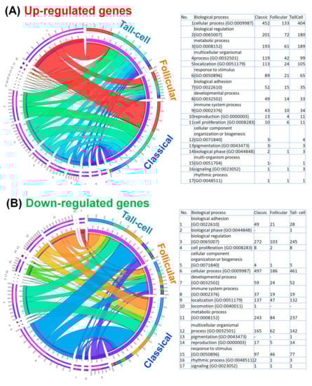 Circos plot, showing the association between the top (A) up-regulated and (B) down-regulated biological processes according to PTC subtypes. The main biological processes, and their specific gene ontology (GO) are listed as a table in the right panel of the figure, presenting the number of genes for each specific GO for the three PTC subtypes.