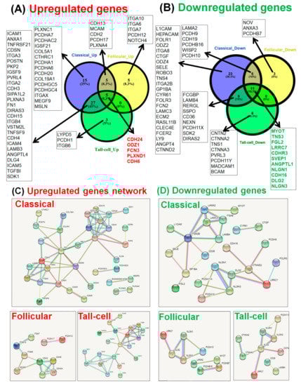 The involvement of biological adhesion molecules in papillary thyroid cancer. Venn diagram for identifying the specific and common (A) upregulated genes and (B) downregulated genes related to biological adhesion in classic, follicular variant, and tall-cell PTC. Biological adhesion molecules interaction network (generated using STRING): (C) upregulated genes and (D) downregulated genes.