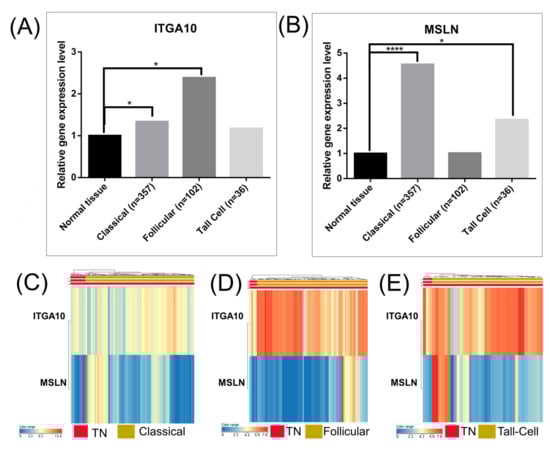 Bar graphs of the global expression levels of (A) ITGA10 (Integrin Subunit Alpha 10) and (B) MSLN (Mesothelin) expressions in the investigated PTC subtypes, generated using the TCGA data analysis (* p ≤ 0.05, ** p ≤ 0.01, *** p ≤ 0.001, **** p ≤ 0.0001). The heatmap representations of the individual expression levels of ITGA10 and MSLN in the investigated subtypes of papillary thyroid cancer: (C) classical, (D) follicular and (E) tall-cell versus TN (normal tissue).