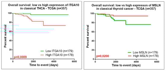 Although the previously established biomarkers for predicting clinical outcomes based on molecular markers related to adhesion molecules have not been a proof of success in clinical management of PTC, it is still relevant to determine the accurate and generalized predictive signatures in this type of cancer. Our study accentuated for the first time a correlation of the overall survival rate to ITGA10 and MSLN in classic PTC. ITGA10 was proved to have an important role in adhesion, migration and/or in the regulation of inflammatory responses [27]. MSLN was observed in several cancer types, meaning it represents an important therapeutic immunological target [28]. Inhibition of MSLN reversed mesenchymal features and attenuated stem cell properties, in addition to inhibiting tumor growth and metastasis in lung cancer models; this could be exploited also for thyroid cancer [29]. Therefore, additional biological adhesion and immunological genes could be utilized to estimate the prognostic impact of the different subtypes of thyroid cancer.