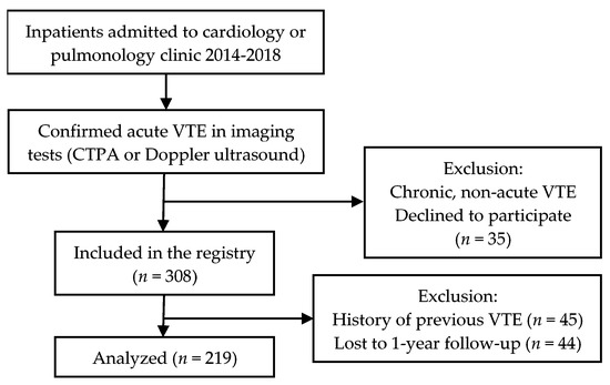 The study cohort included inpatients admitted to cardiology and pulmonology clinics in the Pauls Stradiņš Clinical university hospital in Riga, Latvia from June 2014 till June 2018 (the hospital covers approximately 45,000 inpatients per year). Patients were eligible for our study if the diagnosis of acute VTE was confirmed by imaging studies (Doppler ultrasound, computed tomography angiography) (see Figure 1). All radiographic images were analyzed by experienced radiologists. All included patients had a recent onset of VTE symptoms during the previous 10 days, all patients were subsequently hospitalized. All patients provided written or oral consent for participation in the registry in accordance with local hospital ethics committee requirements (Ethics Committee of Pauls Stradiņš Clinical University Hospital Development Foundation, ID code: 110614-2L, date of approval: 11.06.2014.). Patients with previous VTE (history of any DVT or PE before the index event) were excluded from the present data analysis. We made all efforts to enrol consecutive inpatients admitted to the clinics. Data were recorded in a local computer-based registry.