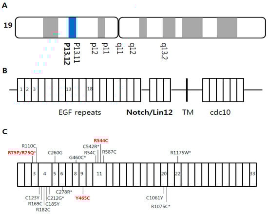 Cerebral autosomal dominant arteriopathy with subcortical infarcts and leukoencephalopathy (CADASIL) is a rare hereditary disease caused by mutations in the NOTCH3 gene, which encodes for the first five epidermal growth factor repeats on chromosome 19p13.12 (Figure 1A,B). CADASIL is characterized by severe white matter changes (WMCs), especially in the anterior temporal (AT) and external capsule (EC) lesions. The main clinical symptoms are recurrent ischemic stroke (IS), migraine, and progressive dementia [].