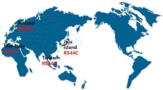 According to previous Caucasian articles, NOTCH3 mutations were frequently found in exons 2–6, especially in exon 4 [,,,]. In British cases, 73% of NOTCH3 mutations were in exon 4 []. However, in 20 subjects in 17 Korean CADASIL families on Jeju Island, 85% of NOTCH3 mutations were in exon 11 and R544C mutations were present in 75% of patients []. This predominance of the R544C mutation is quite interesting. Three of four CADASIL patients with the R544C mutation in exon 11 were born on Jeju Island, which suggests a ‘founder effect’. This founder has been reported in small, isolated islands or inlands such as Taiwan (R544C) [], Finland (R133C) [], and mid-Italy (R607C) [] (Figure 4). There are some Taiwan studies that analyze stroke etiology and radiological findings focused on R544C mutations [,]. According to a prospective, multicenter study in Taiwan, small-vessel occlusion was significantly associated with R544C mutation []. Another Taiwan study demonstrated that of 67 patients with R544C mutations, patients with intracerebral hemorrhage (ICH) onset were more likely to have white matter hyperintensities and higher total cerebral MBs []. Despite a lot of controversy, R75P could be considered the best explained cystein sparing Notch3 mutation to date [,]. Furthermore, recent study demonstrated another cystein sparing Notch3 mutation (D80G) in four German families []. These findings are evaluated as having broadened insight in CADASIL.