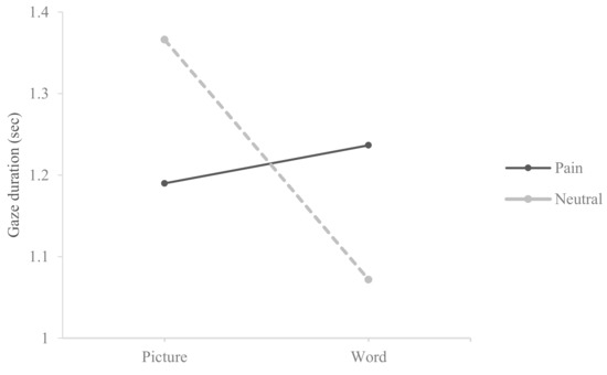 Meta-analytic studies mentioned above suggested that one of the reasons why attentional bias studies demonstrated inconsistent results was due to different stimulus types [1,2]. People may respond to visual and linguistic stimuli differently. According to the dual-coding theory, visual and linguistic information are processed through distinct channels in the human brain [11]. The results of previous studies [12,13,14] support the notion suggested by the dual-coding theory (i.e., differences in the processing between visual and verbal information). Those studies found not only functional differences but also anatomical differences in processing visual and linguistic stimuli in human brain. Although previous studies found evidence for attentional engagement toward pain-related linguistic stimuli [1,2] and attentional engagement toward pain-expression pictures [3,4,5] among chronic pain individuals, similarities and differences in the attentional engagement of chronic pain individuals toward different pain stimulus modalities have rarely been compared using eye tracking methodology. Studies, such as ours, that directly compare different pain stimulus modalities as part of investigating the pain attentional bias of chronic pain patients will provide valuable information to develop the most effective psychological intervention for chronic pain patients.