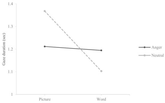 In terms of stimuli, in total 32 picture pairs and word pairs (i.e., 16 pairs of ‘pain–neutral’, 16 pairs of ‘anger–neutral’) were shown. Each photo and word appeared equally on the left and right side to control the position bias (i.e., the habit of reading from the left to the right) [3]. To prevent the effect of learning influencing the gaze behaviors of the participants, the presentation sequence of picture and word stimuli was randomized for each participant. The Tobii TX300 eye tracker system defined fixation as the amount of time participants did not deviate their gaze from a defined area of interest (AOI). AOI for the photo and word stimuli was established based on the previous studies [3,21]. To assess the attentional engagement to different stimuli, the total gaze duration for each stimulus (i.e., the averages of total fixation durations within an AOI during the specified time) was calculated. The 3000 ms presentation time was selected to observe maintained attention [3].