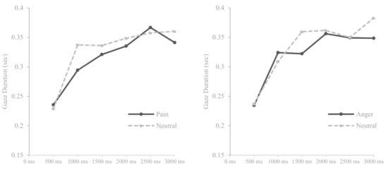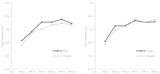 Means of gaze durations for pain and anger faces compared with neutral faces over six times.