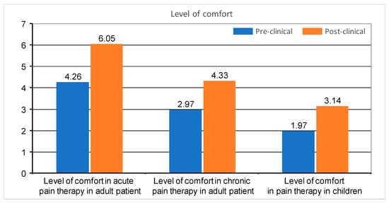 On a similar linear 11-point scale, where 0 was marked as complete lack of comfort and 10 meant feeling very comfortably, the students were asked about their level of comfort in the treatment of acute and chronic pain in adults and the treatment of pain in children. The average level of comfort in the post-clinical group regarding the treatment of acute pain was significantly higher than in the pre-clinical group (6.05 vs. 4.26, p = 0.006), similarly with chronic pain treatment in adults (4.33 vs. 2.97, p = 0.021) and pain treatment in children (3.14 vs. 1.97, p = 0.026). Both groups were much more confident in the treatment of acute pain in adults, followed by chronic pain treatment in adults, while the least confident in the treatment of pain in children (Figure 1).