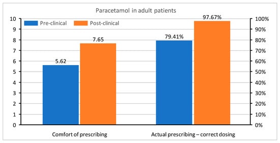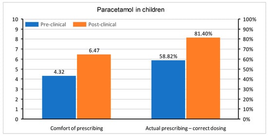 Comfort of prescribing (p = 0.001) and the actual prescribing of correct doses of paracetamol in pediatric patients (p = 0.054) in pre-clinical and post-clinical students [comfort is shown as mean for the whole group (on a 0–10 scale) and correct dosing as percentage of student choosing a correct dose (0–100%)].