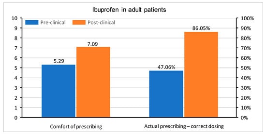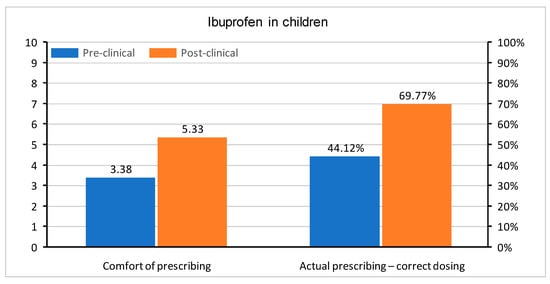Comfort of prescribing (p = 0.002) and the actual prescribing of correct doses of oral ibuprofen in pediatric patients (p = 0.023) in pre-clinical and post-clinical students [comfort is shown as mean for the whole group (on a 0–10 scale) and correct dosing as percentage of student choosing a correct dose (0–100%)].