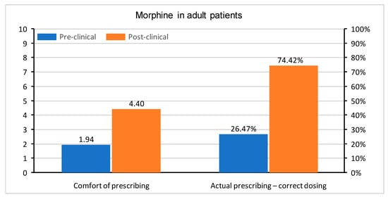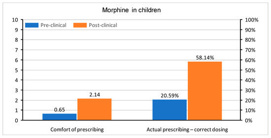 Figure 6 and Figure 7 show responses regarding the comfort of prescribing of intravenous morphine and the actual correct dosage of this medication. The actual knowledge in post-clinical group was higher than the comfort with which the respondents approached the issue, both when prescribing intravenous morphine in adults (correct dosing 74.42% of Group II, comfort—mean 4.4) and in children (correct dosing 58.14% of Group II, comfort—mean 2.14).