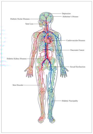 A cross-section image of the parts of human body that can be affected by diabetic complications. Image of human body generated using Chembiodraw (v. Ultra 14.0).