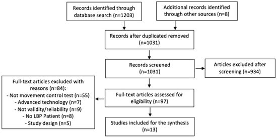 The database research identified 1203 articles, while 8 others have been identified with free research in the bibliographies of relevant studies for a total of 1211 articles; 180 articles were deleted because they were duplicated, resulting in 1031 basic articles as a partial result. Following the reading of the title, 386 articles were discarded; following the reading of abstract, 548 remained. Following the reading of the full text, 13 studies were included in the review and 84 studies were excluded as not relevant. The steps related to the selection of articles are outlined in the flow-diagram below (Figure 1). Of the 13 studies included, 10 investigated inter-rater reliability [28,29,30,31,32,33,34,35,36,37], 4 investigated intra-rater reliability [31,32,33,38], and only 6 studies analyzed validity [28,29,31,32,39,40]. Overall, the tests showed reliability ranging from fair to excellent (K value between 0.32 and 1.00) for the inter-rater and from moderate to excellent for the intra-rater (K value from 0.42 to 1.00). The ICC also varied from 0.41 to 0.98, indicating a range from poor to very good (Table A1). A meta-analysis of collected data was not conducted due to the small number of studies that have investigated the same test. In addition to this, the highly heterogeneous nature of the descriptions and the small samples make the calculation superfluous.