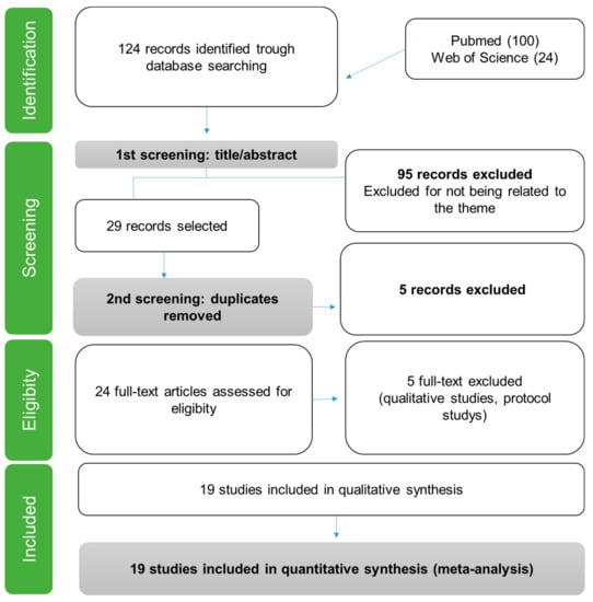 The first search generated a total of 124 articles. After filtering by reading titles, abstracts, and duplicates, 95 studies were excluded and 29 articles were selected for a reading of the full text. Of these, 21 articles met the inclusion criteria, as is illustrated in Figure 1.