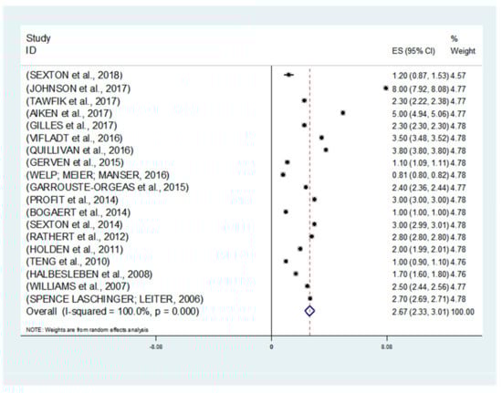 The results revealed an association between burnout and patient safety permeating the work process, personal characteristics, and teamwork [,,,,,,,,,,,,,,,,,,,,]. Although some studies indicate this association in a less significant way, the meta-analysis shows an association of more than 60%.