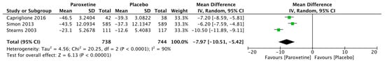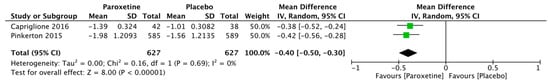 Women who were treated with low-dose paroxetine had a significant reduction of hot flushes episodes (evaluated as mean weekly reduction from baseline) compared to placebo (mean difference −7.97 [−10.51, −5.42] episodes/week) (Figure 3) (Table 2).