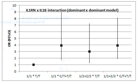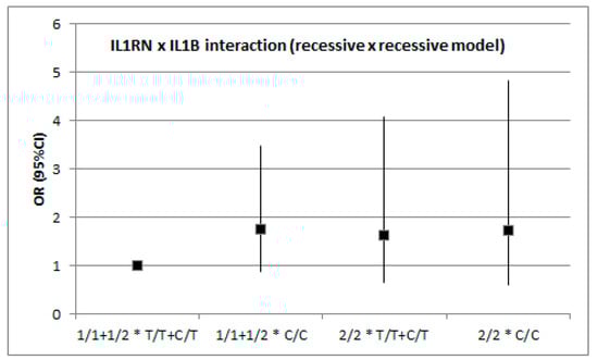 We found no interaction between IL1RN and IL1B concerning IS risk assuming the dominant x dominant and recessive x recessive models. The gene–gene interaction was analyzed using a linear model in which only two (and the same) inheritance patterns for each locus were considered. This approach could possibly have less power as compared with a non-parametric and model-free multifactor dimensionality reduction method that has been shown to have reasonable power to detect epistasis [].