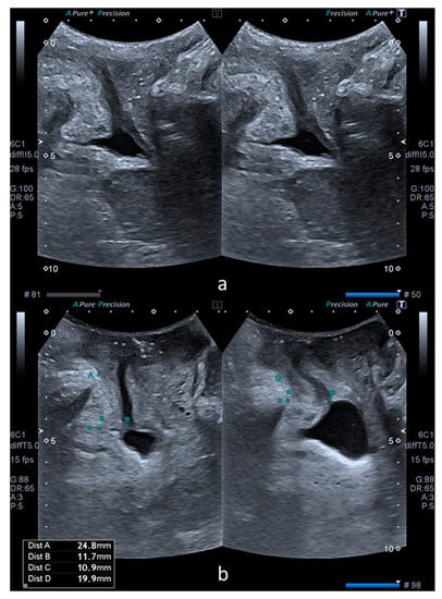 - Sarnelli, G.; Trovato, C.; Imarisio, M.; Talleri, D.; Braconi, A. Ultrasound assessment of the female perineum: Technique, methods, indications and ultrasound anatomy. Radiol. Med. 2003, 106, 357–369. [Google Scholar] [PubMed]