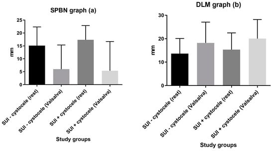 The SPBN values were significantly higher at rest than on Valsalva for both control (15.38 ± 7.21 mm vs. 6.48 ± 9.42 mm; p < 0.0001) and cystocele (17.28 ± 6 mm. vs. 5.36 ± 8 mm; p < 0.0001) groups. The DLM values were significantly lower at rest than at Valsalva for both control (13.47 ± 6.37 mm vs. 18.22 ± 8.8 mm; p = 0.0002) and cystocele (15.08 ± 7.16 mm vs. 20.04 ± 8.11 mm; p = 0.0014) groups (Figure 2).