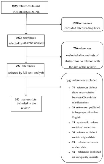 In the last years, skin diseases are acquiring more and more importance among the extra-intestinal manifestations of CD [4]. The aim of this review is to summarize the association between cutaneous diseases and CD. For this reason, searches were undertaken in the PubMed/Medline database in March 2019 using the following terms: A combined research of “celiac disease” and “skin”, “blistering diseases”, “cutaneous manifestations”, “pemphigus”, and other skin disorders. In this way, 7923 articles were found and 100 were selected as reported in Figure 1. In addition, the studies were rated using the Oxford Centre for Evidence Based Medicine 2011 and levels of evidence assigned to each association [6]. The assigned levels of evidence were discussed among members until consensus was reached (Table 1).