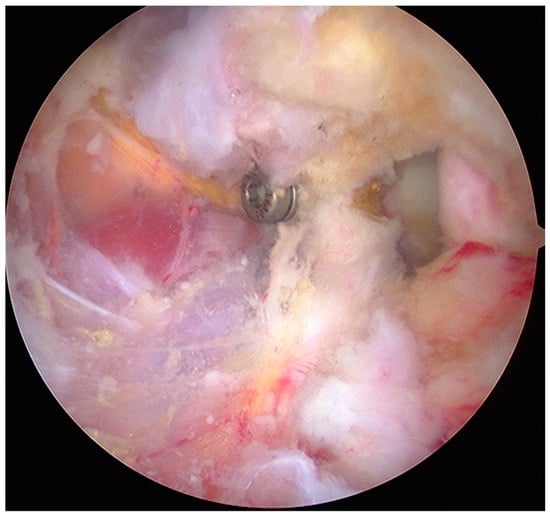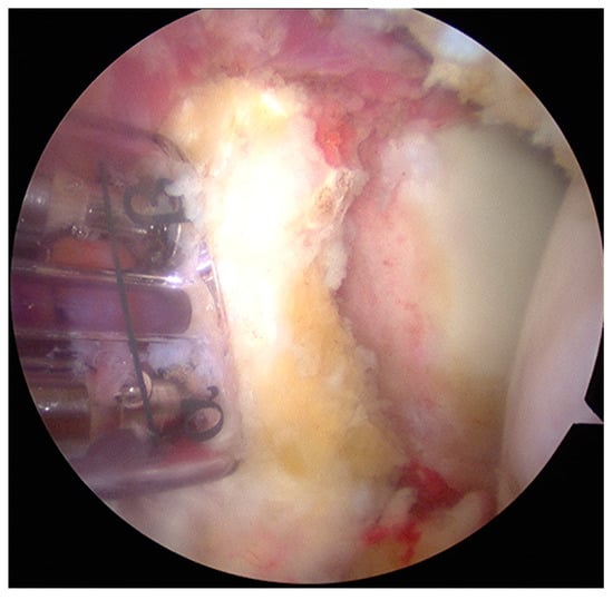 - Joint evaluation and exposure through a posterior portal and an anterior portal. The lateral side of the coracoids was analyzed, opening the rotator interval. The coracoacromial ligament was released.