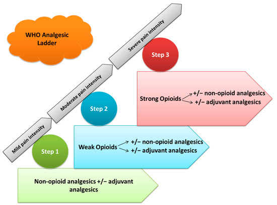The first step the of analgesic ladder is used for treating mild pain and includes non-opioids analgesics, such as acetaminophen (paracetamol), and non-steroidal anti-inflammatory drugs (NSAIDs) with or without adjuvant analgesics [4,8,9,10]. The second step of the analgesic ladder consists of weak opioids, such as tramadol or codeine, which are used for mild to moderate pain. Lower doses of a step III opioid, such as morphine or oxycodone, should be administered instead of codeine or tramadol, with or without non-opioids analgesics and adjuvant analgesics [5,8,9,10]. The third step of the analgesic ladder treats moderate to strong pain via strong opioids, such as morphine or oxycodone, with or without non-opioids analgesics and adjuvant analgesics [5,8,9,10]. The correct application of the WHO pain ladder can help to successfully manage pain and provide effective analgesia for patients.