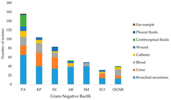 Recent studies of the prevalence of AMR have shown a high increase in resistant infections, especially in intensive care unit (ICU) areas [10,11,12,13]. The patients in ICU are vulnerable as they are exposed to different invasive procedures, such as intubation, mechanical ventilation, and vascular access. In addition, many of the drugs employed can give rise to inhibition of their immune response [14]. The different studies have reported that the most commonly isolated organisms in patients in ICU comprise gram-negative bacilli (GNB), mainly Enterobacteriaceae species, and non-fermenting gram-negative bacilli (NF-GNB), such as Pseudomonas and Acinetobacter species [13,15,16]. GNB were responsible for 45–70% of ventilator-associated pneumonias, for 20–30% of vascular pathway infections (catheter), and for commonly caused infections in surgical wounds and in the urinary tract that led to sepsis [17]. In addition, in the last several years, the occurrence of highly resistant microorganisms (HRMO) is a major threat to patients in ICU, leading to worse outcomes, the need for isolation measures, and the demand for second-line or rescue antibiotics [18].