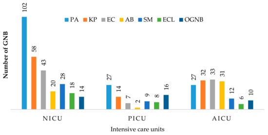 Frequency of GNB among three intensive care units (Neonatal, NICU, Pediatric, PICU, and Adult, AICU) PA: P. aeruginosa, KP: K. pneumoniae, EC: E. coli, AB: A. baumannii; SM: S. maltophilia; ECl: E. cloacae; OGNB: Other GNB. OGNB including P. mirabilis (n = 9), S. marcescens (n = 9), Burkholderia spp. (n = 9), A. lwoffi (n = 8). and K. oxytoca (n = 5).