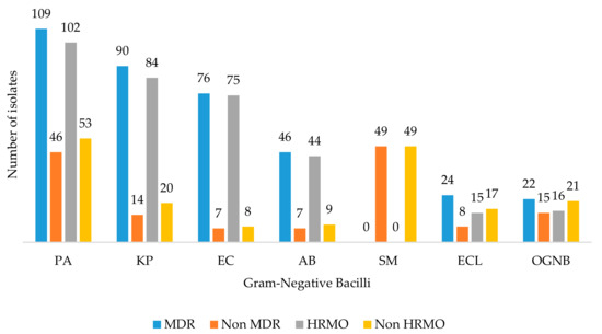 HRMO are microorganisms that 1) are known to cause disease, 2) have acquired an AMR pattern that hampers therapy, and 3) have the potential to spread if, in addition to standard precautions, no transmission-based precautions are taken [35]. Kluytmans-VandenBergh et al. [35] defined HRMO as (1) Enterobacteriaceae that are ESBL-producing and/or resistant to carbapenems and/or resistant to fluoroquinolones and aminoglycosides (F and A), (2) Acinetobacter spp. that are resistant to carbapenems and/or resistant to F and A, (3) S. maltophilia resistant to Co-trimoxazole, and (4) P. aeruginosa resistant to at least three of following antimicrobial or antimicrobial groups: Piperacillin, Ceftazidime, F and A, and/or carbapenems [35,36]. This study demonstrated a high number of clinical isolates with an HRMO profile. A total of 65.50% of GNB exhibited the HRMO profile. The highest percentages of HRMO were recovered in clinical isolates of E. coli (90.36%), A. baumannii (83.02%), and K. pneumoniae (80.77%).