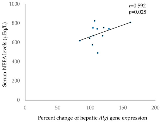 Correlation between serum non-esterified fatty acid (NEFA) levels and liver Atgl expression levels 30 min after topical application of jojoba oil. Serum NEFA levels were significantly correlated with liver Atgl expression levels (r = 0.592, p = 0.028).
