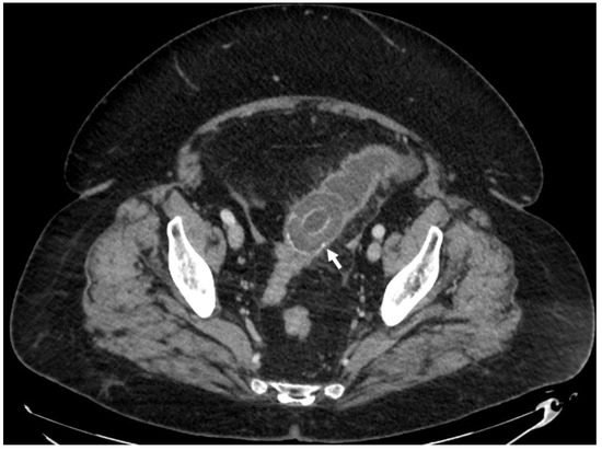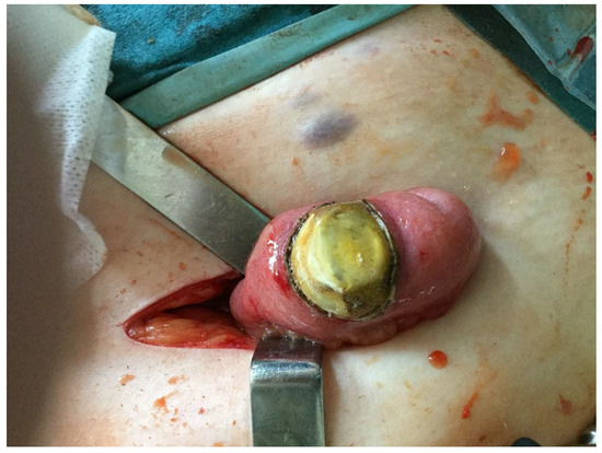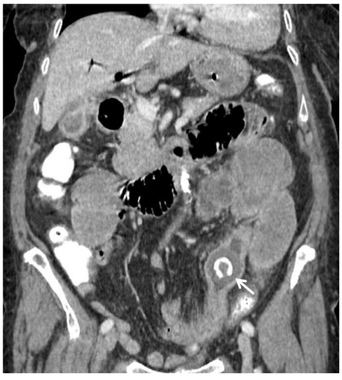 - Lindsey, T.M. Gallstone Ileus in the Absence of a Gallbladder: A Case Report. Arch. Surg. 1975, 110, 448. [Google Scholar] [CrossRef]