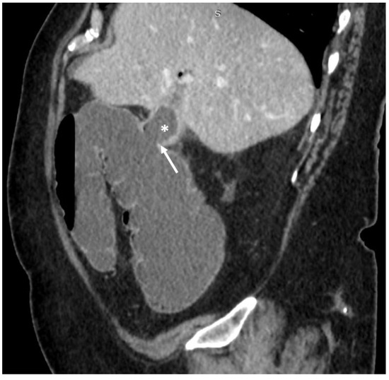 69-year-old female. Abdominal CT scan, sagittal plane, portovenous phase. Collapsed gallbladder (asterisk), there is a defect in the wall connecting the lumen of the gall bladder with the lumen of hepatic flexure of the colon–cholecystocolic fistula (arrow).