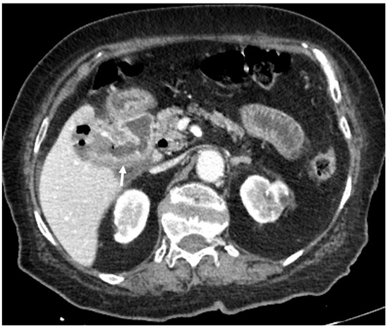 87-year-old female. Abdominal CT scan, axial plane, portovenous phase. Collapsed gallbladder, with thickened walls, pericholecystitis and air in the pericholecystic space. Also, a connecting path between the gallbladder and duodenum is visible (arrow)—cholecystoduodenal fistula.
