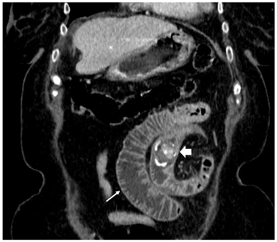87-year-old female. Abdominal CT scan, coronal plane, portovenous phase. Dilated segment of proximal jejunal loops (thin arrow) caused by migrated gallstone (thick arrow) obstruction. Distal to the gallstone, jejunal loops are collapsed.