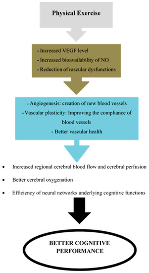 This hypothesis, which was proposed for the first time by Dustman and collaborators [23], suggests that physical exercise, particularly aerobic exercise, which increases cardiorespiratory fitness, increases cerebral perfusion and regional cerebral blood flow [24]. This induces increased oxygen and glucose transportation to the brain, which results in improved cognitive functioning [25,26]. Several biological mechanisms can underlie this hypothesis. One mechanism is angiogenesis, which is defined as a primary mechanism of formation of new capillaries from existing blood vessels [27]. Beyond the developmental period, the formation of new capillaries in the brain may occur under the influence of the stimulation of physical exercise [28]. Indeed, regular physical exercise can induce the proliferation of a protein called vascular endothelial growth factor (VEGF), which is the main precursor of angiogenesis [24]. However, the peptide hormone insulin-like growth factor one (IGF-1) secreted by the liver also plays an important role in the mechanism of angiogenesis. This peptide hormone promotes the growth of the cerebral blood vessels and influences the regulation of VEGF [29]. Evidence of this angiogenesis mechanism has been supported by the work carried out in animals. In rodents, regular voluntary physical exercise increases angiogenesis in the motor cortex [30], in the dentate gyrus [31], and finally in the cerebellar cortex [32].