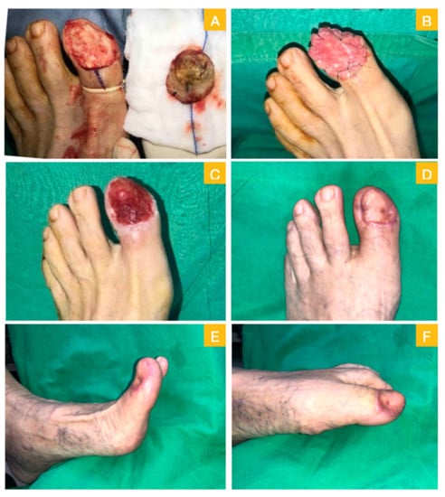 Case 2. (A) Wide excision with total nail bed and germinal matrix removal, bone exposure was noted; (B) acellular dermal matrix for stage one repair; (C) day 21 with healthy granulation; (D) 42 days after skin graft; and (E,F) intact toes movement.