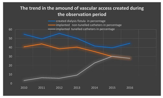 On the basis of the current analysis of clinical data of patients undergoing dialysis in 2010–2016, it was proved that despite the KDOQI’s recommendations for limiting the number of implanted catheters in relation to dialysis fistulas, their percentage is still increasing. The study showed that during the observation period, it increased from 3.35% in 2010 to 27.98% in 2016.