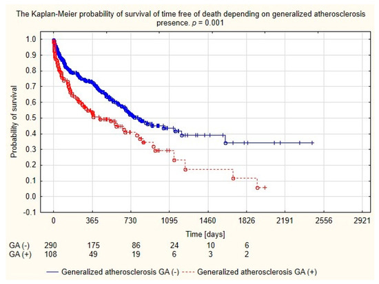 Probability of survival depending on the generalized atherosclerosis in the population of patients dialyzed with permanent catheters.