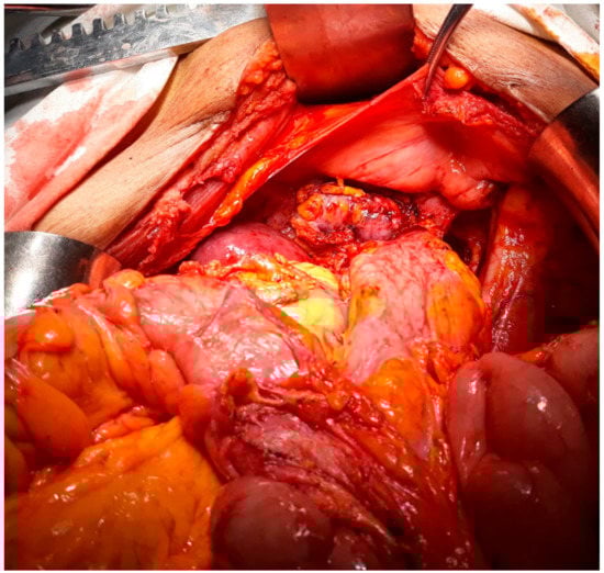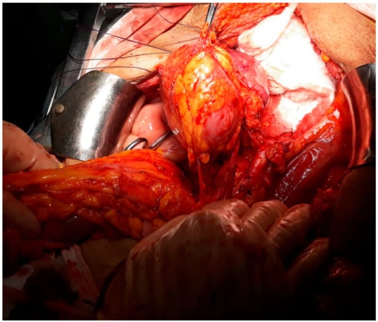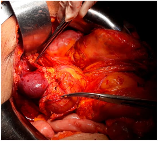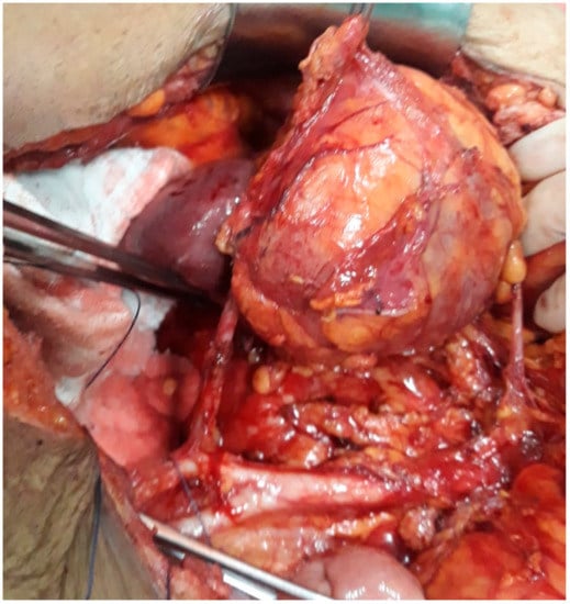 This study was approved by the hospital ethical committee (the ethical code number was 93/21.8.2019). A 54-year-old postmenopausal female patient was investigated for diffuse pelvic pain, vaginal bleeding and fever, and was diagnosed with a large cervical tumor invading the rectum and the urinary bladder, in association with a massive peritumoral abscess. In the meantime, a left pelvic kidney, with no demarcation line with the tumoral process, was described during the preoperative computed tomography scan. At the time of presentation, the patient presented constant vesperal fever in association with biological inflammatory syndrome. Due to the finding of a large pelvic abscess in association with the clinical–biological condition of the patient, surgery as the first therapeutic intention was decided. Intraoperatively, a large pelvic tumor invading the rectum and the urinary bladder, in association with local perforation and a secondary abscess, was found. In the meantime, invasion of the upper renal pole was also certified (Figure 1, Figure 2, Figure 3 and Figure 4).